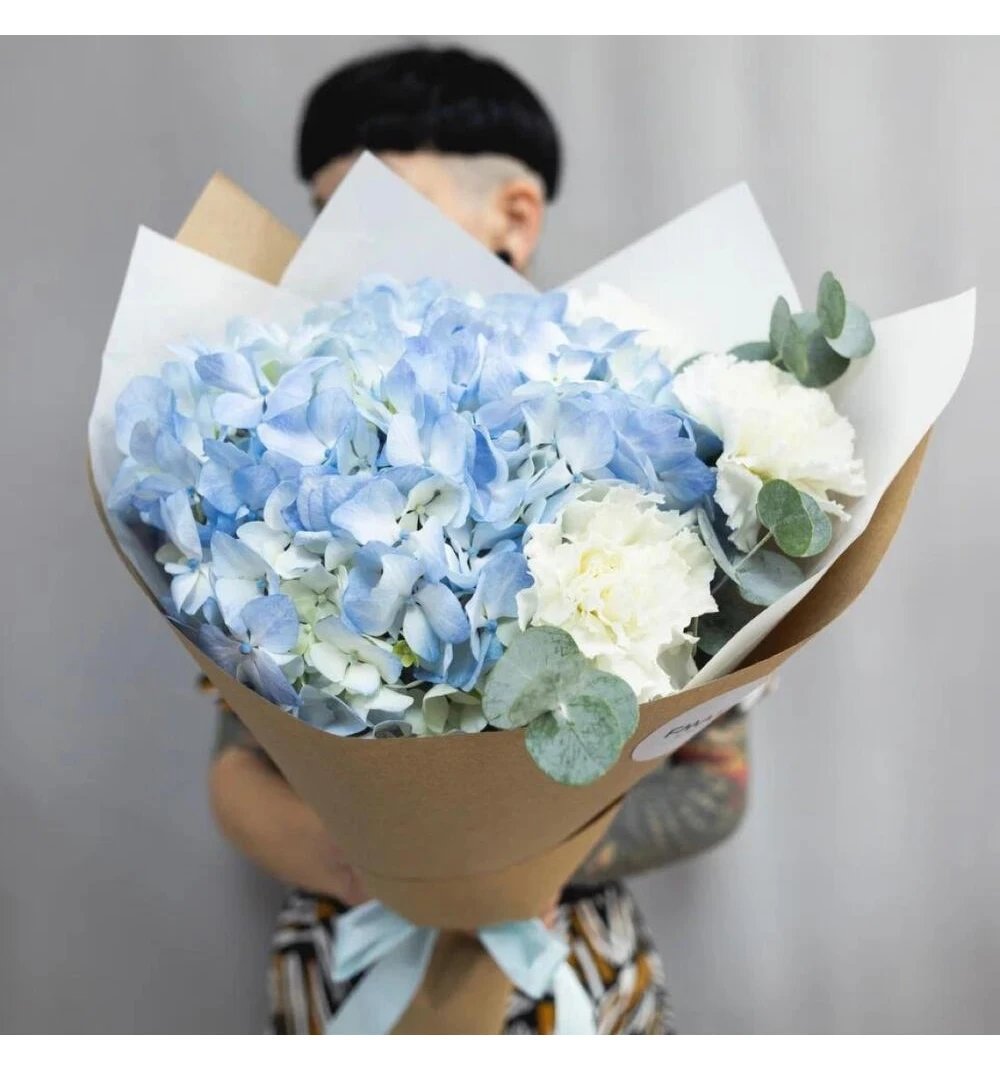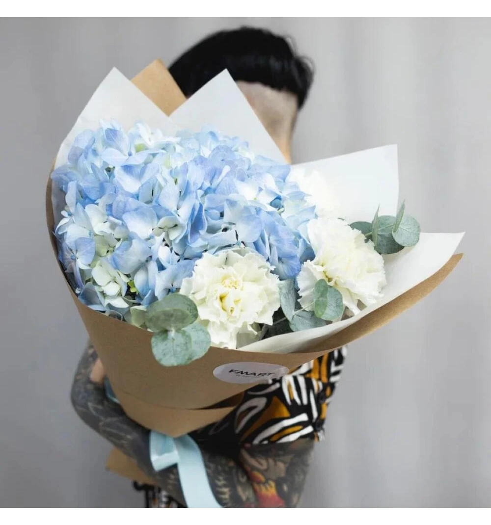 Букет комплимент с голубой Гортензий и белыми Диантусами